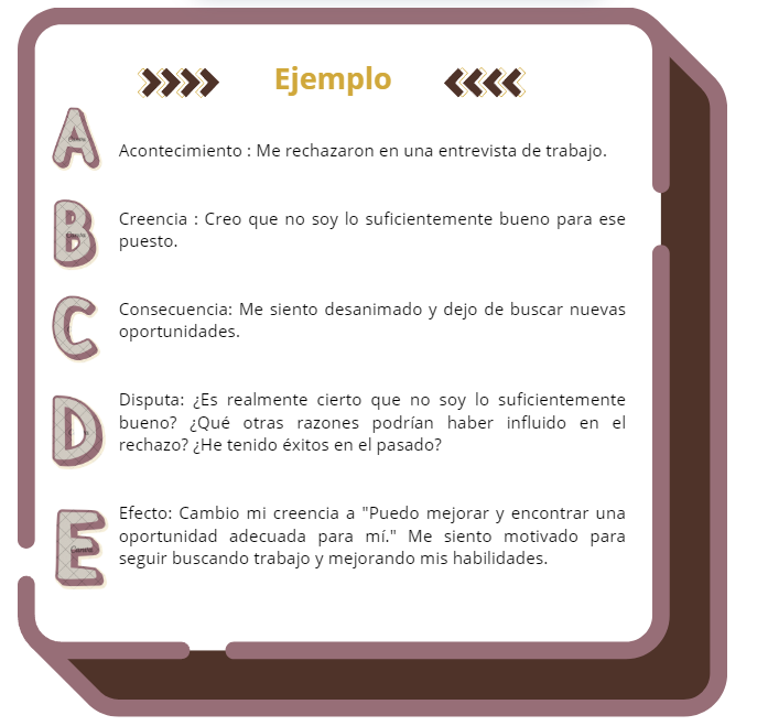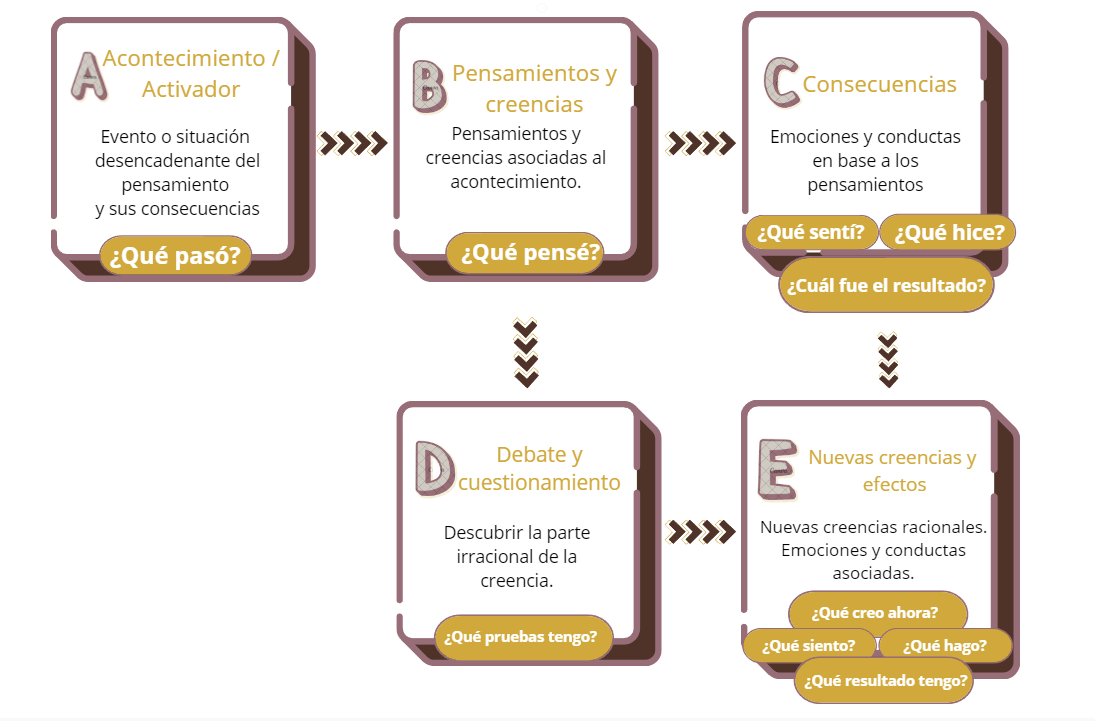 Esta ampliación hizo que el modelo fuera más robusto y práctico para la terapia, facilitando un enfoque más estructurado para desafiar y reemplazar pensamientos irracionales y limitantes con creencias más racionales y adaptativas.