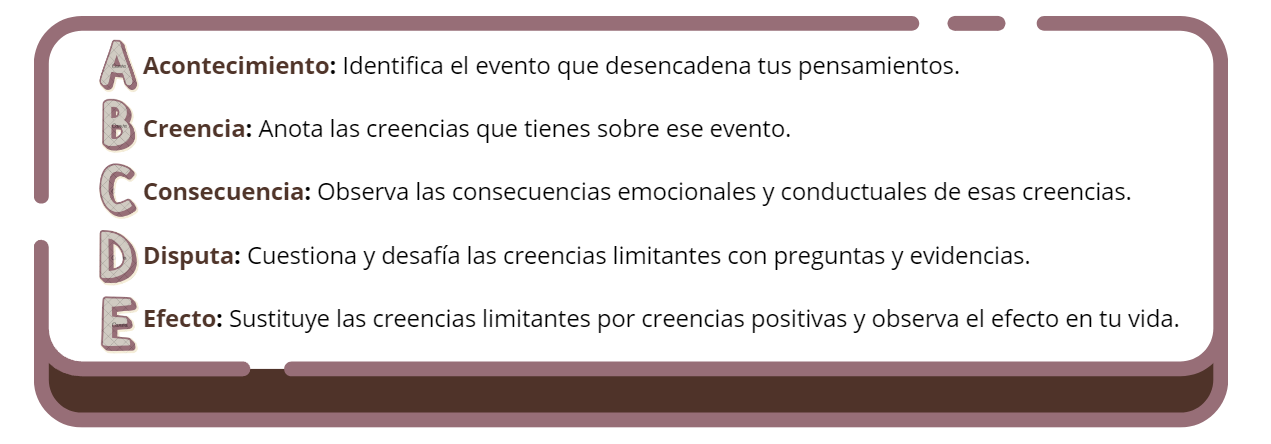 Para acompañarte en este proceso, te propongo una metodología en 3 pasos, inspirada en el modelo ABC-DE de Albert Ellis.