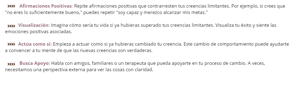 Puede parecer un poco denso, así que te recomiendo leerlo con calma. Como te comenté al inicio transformar las creencias limitantes puede ser un proceso desafiante, pero los resultados valen la pena. Al identificar, cuestionar y reemplazar estas creencias, podremos liberar nuestro potencial y vivir una vida más plena y satisfactoria.